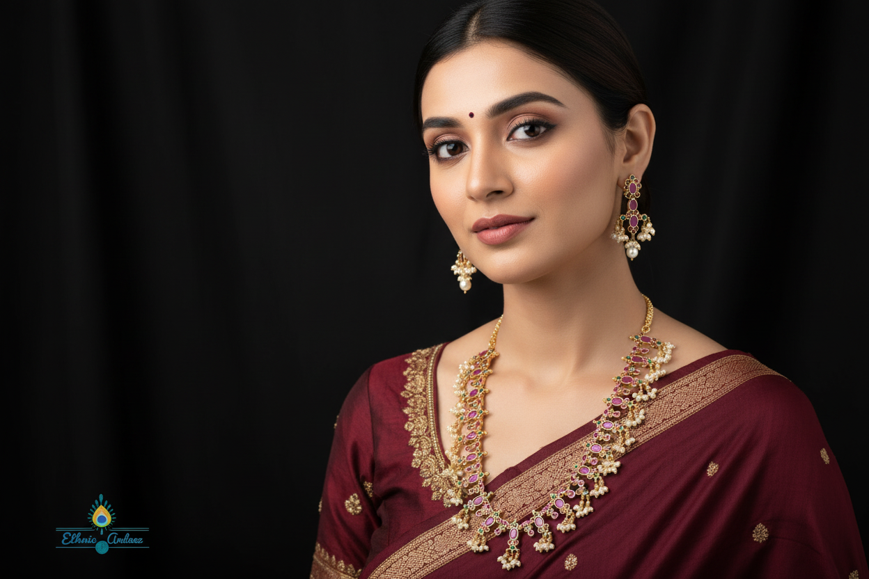 The Opal GP Set features a stunning long design adorned with genuine ruby and emerald stones, further elevated with elegant pearl drops. Elevate your style and add a touch of sophistication to any outfit with this exquisite set. Perfect for any occasion, this set is sure to make a statement.